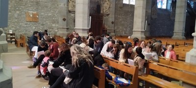 Temps de prière personnelle - Chaque enfant pose son lumignon devant le tabernacle et prie dans le secret de son coeur.
