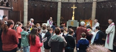 La plus part des enfants étaient présents et accompagnés et tous avaient leur cahier avec le questionnaire bien complété... Nous sommes entrés dans ce temps de célébration avec le chant: